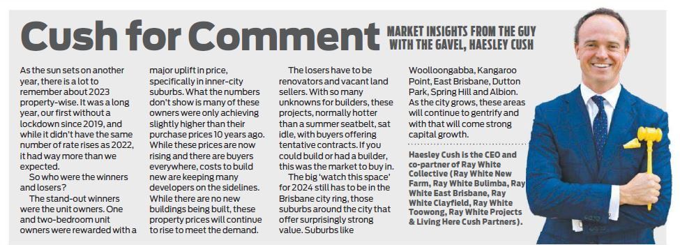 While these prices are now rising and there are buyers everywhere, costs to build new are keeping many developers on the sidelines. While there are no new buildings being built, these property prices will continue to rise to meet the demand. The losers have to be renovators and vacant land sellers. With so many unknowns for builders, these projects, normally hotter than a summer seatbelt, sat idle, with buyers offering tentative contracts. If you could build or had a builder, this was the market to buy in. The big ‘watch this space’ for 2024 still has to be in the Brisbane city ring, those suburbs around the city that offer surprisingly strong value. Suburbs like Woolloongabba, Kangaroo Point, East Brisbane, Dutton Park, Spring Hill and Albion. As the city grows, these areas will continue to gentrify and with that will come strong capital growth.
